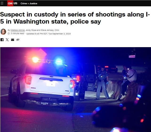 據(jù)美國有線電視新聞網(wǎng)(CNN)3日?qǐng)?bào)道,美國官員們稱,華盛頓州西雅圖和塔科馬市5號(hào)州際公路部分路段發(fā)生一系列槍擊事件,造成6人受傷,嫌疑人已被拘捕。