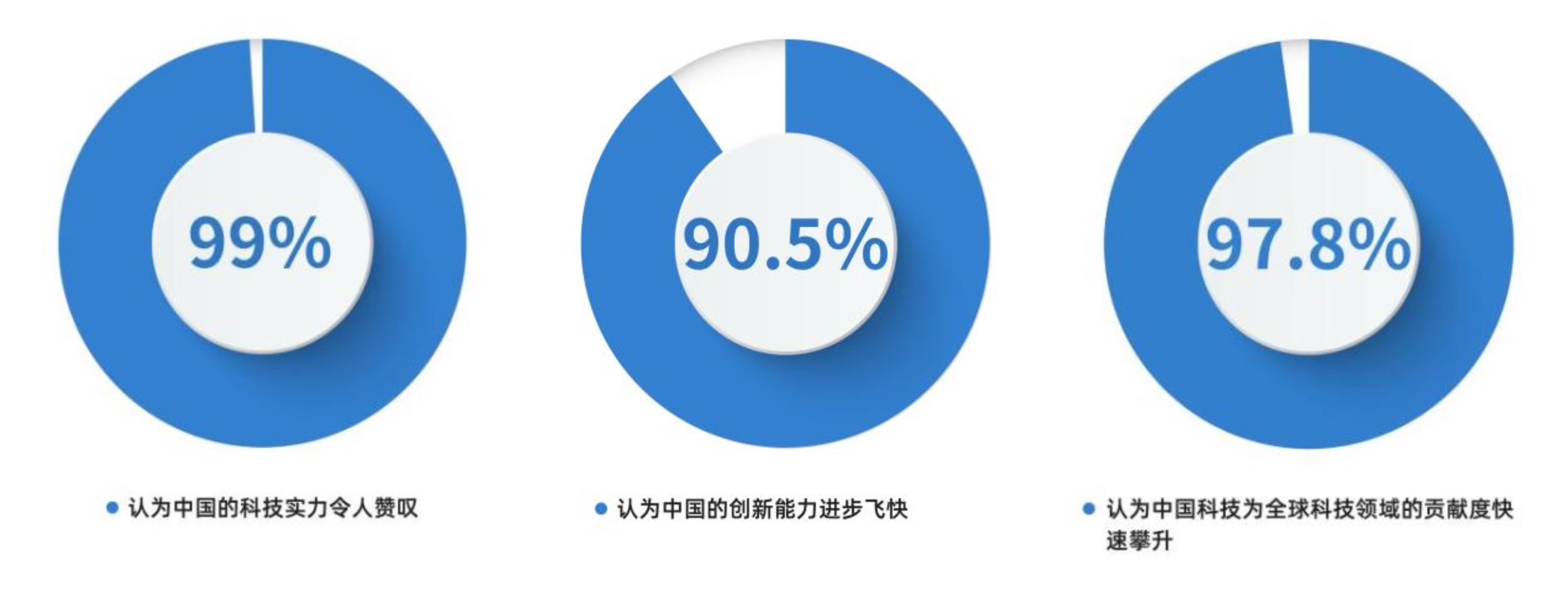 此外,99%的受訪青年認為中國的科技實力令人贊嘆,90.5%的受訪青年認為中國的創(chuàng)新能力進步飛快,97.8%的受訪青年認為中國科技為全球科技領域的貢獻度快速攀升。
