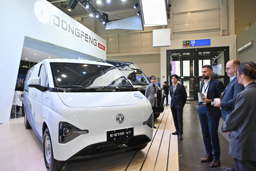 9月16日,在德國(guó)漢諾威國(guó)際交通運(yùn)輸博覽會(huì)媒體預(yù)展上,人們?cè)跂|風(fēng)汽車(chē)展區(qū)參觀E-STAR V7商用車(chē)。新華社記者任鵬飛攝