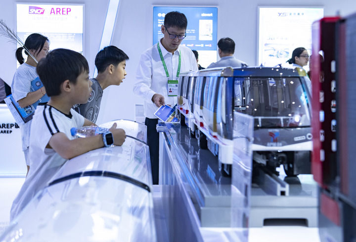 9月21日,在2024世界制造業(yè)大會(huì)上,小朋友參觀體驗(yàn)阿爾斯通跨座式單軌列車。新華社記者 黃博涵 攝