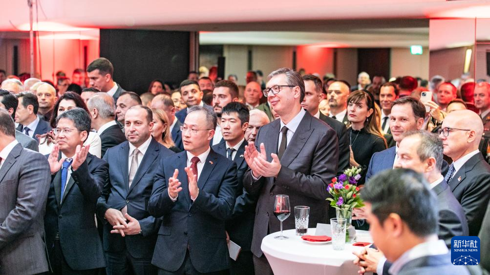 9月18日,在塞爾維亞首都貝爾格萊德,塞爾維亞總統(tǒng)武契奇(前中右)出席中國駐塞爾維亞大使館國慶75周年招待會。新華社發(fā)(王韡攝)