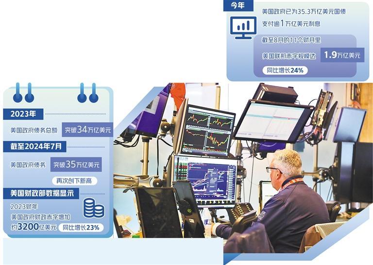 美國財(cái)政部9月12日發(fā)布的月度聯(lián)邦政府收支報(bào)告顯示,今年美國政府已為35.3萬億美元國債支付逾1萬億美元利息。償債成本上升也與美國8月財(cái)政赤字大幅上升相吻合。截至8月的前11個財(cái)月里,美國聯(lián)邦赤字規(guī)模達(dá)1.9萬億美元,同比增長24%。美國財(cái)政赤字曾在2020財(cái)年達(dá)到3.13萬億美元的峰值,此后兩年雖呈下降趨勢,但在2023財(cái)年又有所上漲:美國財(cái)政部數(shù)據(jù)顯示,2023財(cái)年美國政府的財(cái)政赤字增加了約3200億美元,同比增長23%。一方面,經(jīng)濟(jì)的衰退和各種減稅法案的實(shí)施導(dǎo)致財(cái)政收入減少;另一方面,為刺激經(jīng)濟(jì)增長,財(cái)政支出又不斷增加,這就導(dǎo)致財(cái)政赤字不斷攀升,只有通過發(fā)債彌補(bǔ)財(cái)政赤字,形成惡性循環(huán)。
