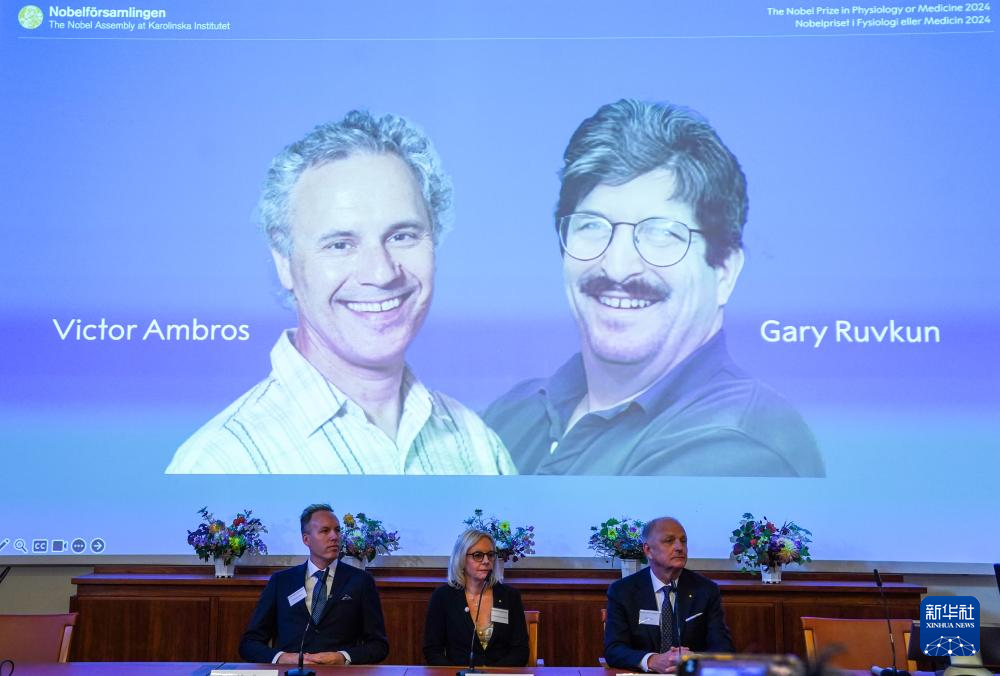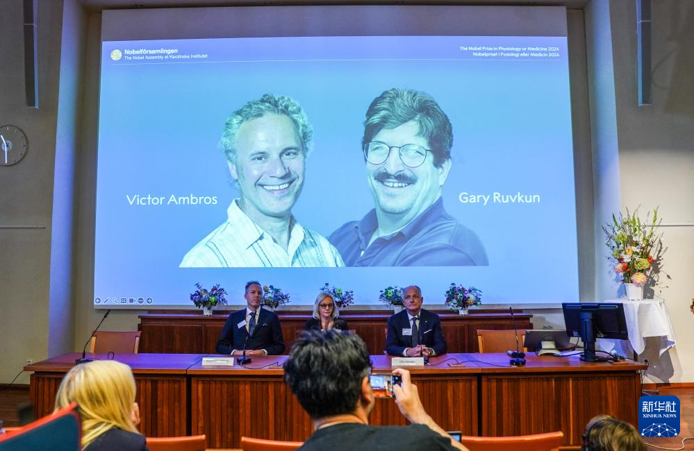 10月7日,在瑞典斯德哥爾摩舉行的2024年諾貝爾生理學(xué)或醫(yī)學(xué)獎公布現(xiàn)場,屏幕顯示獎項得主美國科學(xué)家維克托·安布羅斯(左)和加里·魯夫坎的照片。新華社記者 彭子洋 攝