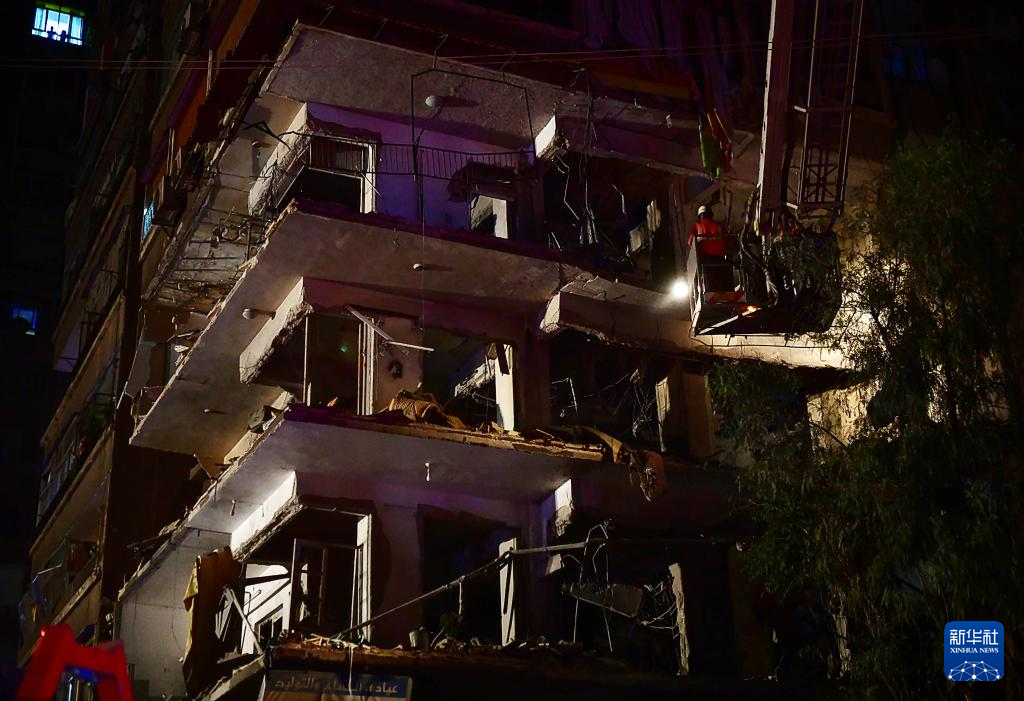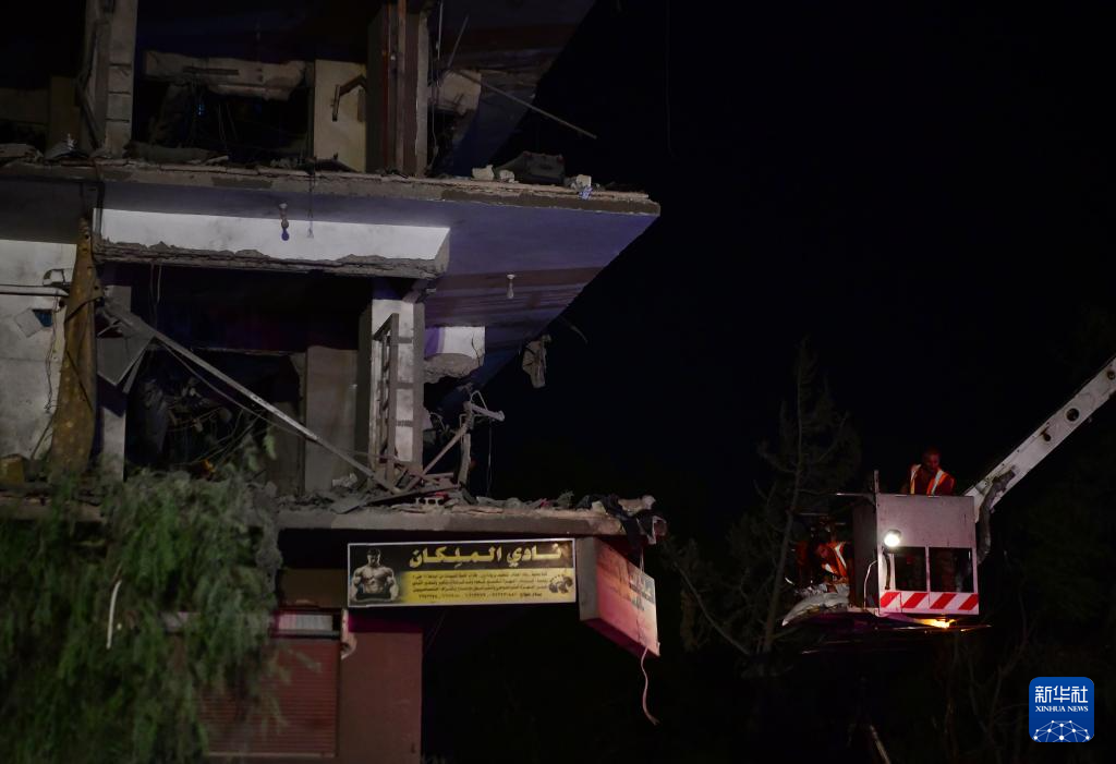 10月8日,在敘利亞首都大馬士革西部邁宰區(qū),救援人員在遭襲居民樓旁工作。新華社發(fā)(阿馬爾·薩法爾賈拉尼攝)