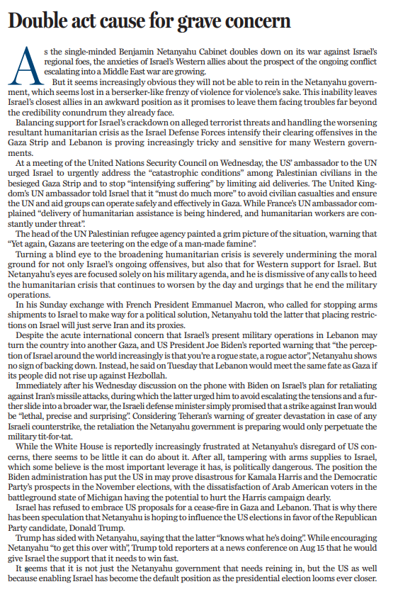 以色列拒不接受美國提出的在加沙和黎巴嫩?;鸬慕ㄗh,白宮對(duì)內(nèi)塔尼亞胡無視美國關(guān)切深感沮喪,卻似乎無能為力。拜登政府如果停止對(duì)以色列的武器供應(yīng),在國內(nèi)政治上將是危險(xiǎn)的,可能會(huì)對(duì)哈里斯的選情造成不利影響。面對(duì)中東戰(zhàn)火蔓延,生靈涂炭,拜登政府進(jìn)退維谷,無計(jì)可施。