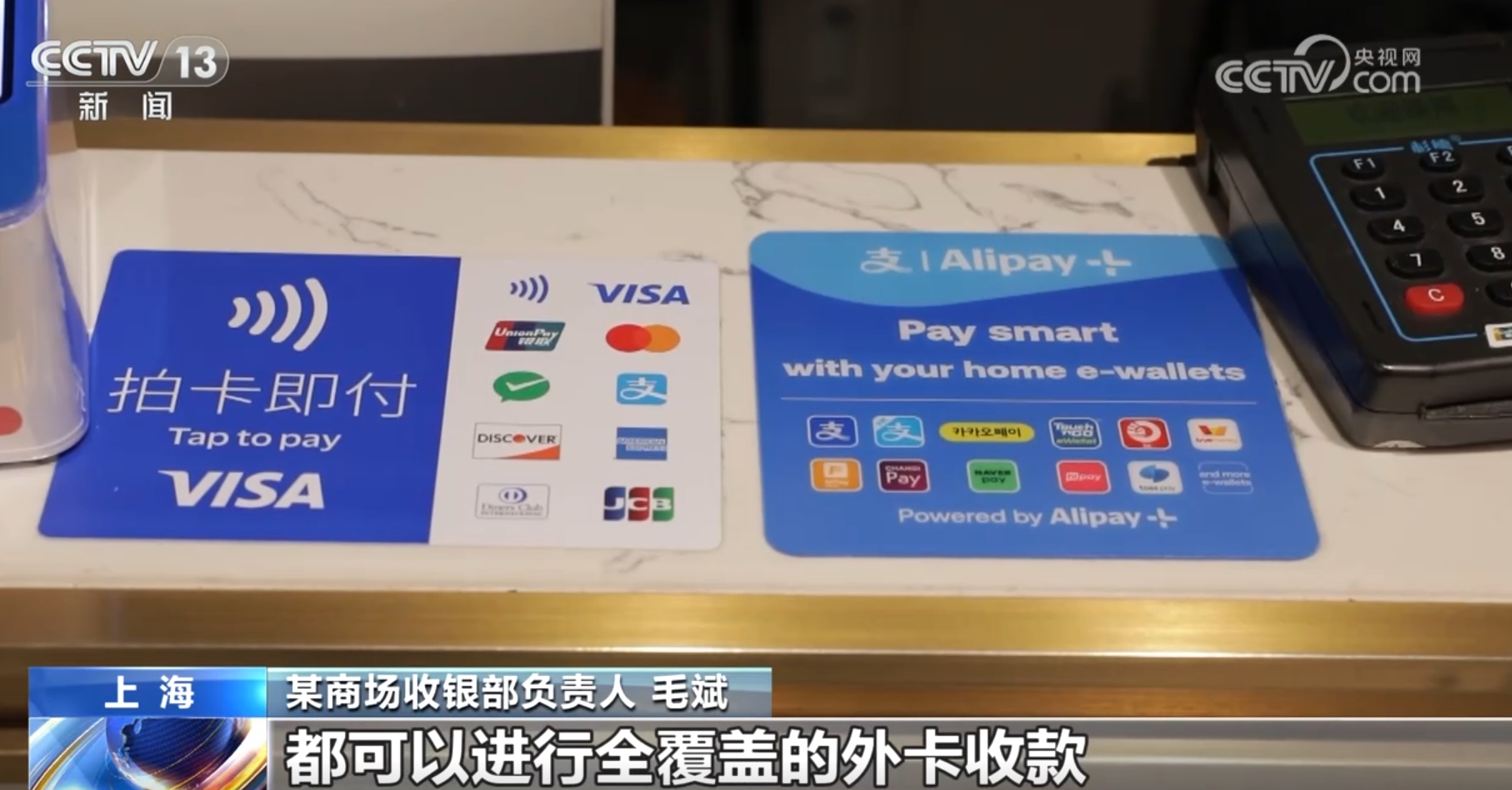 某商場收銀部負(fù)責(zé)人毛斌稱:“外國顧客到我們商場購物越來越多了,所以我們針對(duì)外國顧客的付款方式進(jìn)行了收銀方面的調(diào)整改進(jìn),目前商場所有的收銀設(shè)備都可以進(jìn)行全覆蓋的外卡收款?!?/p>