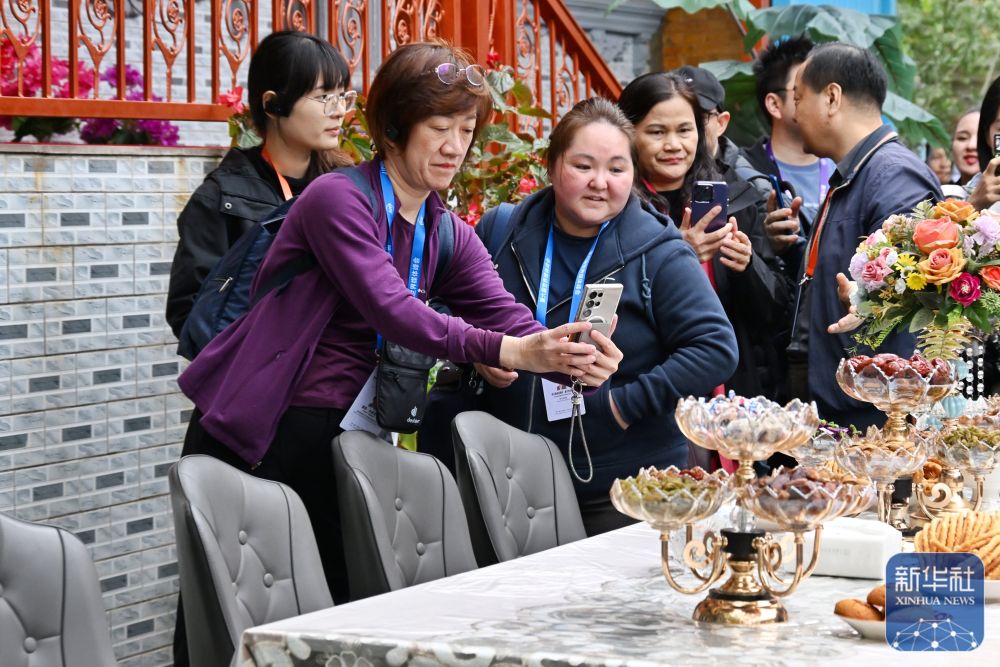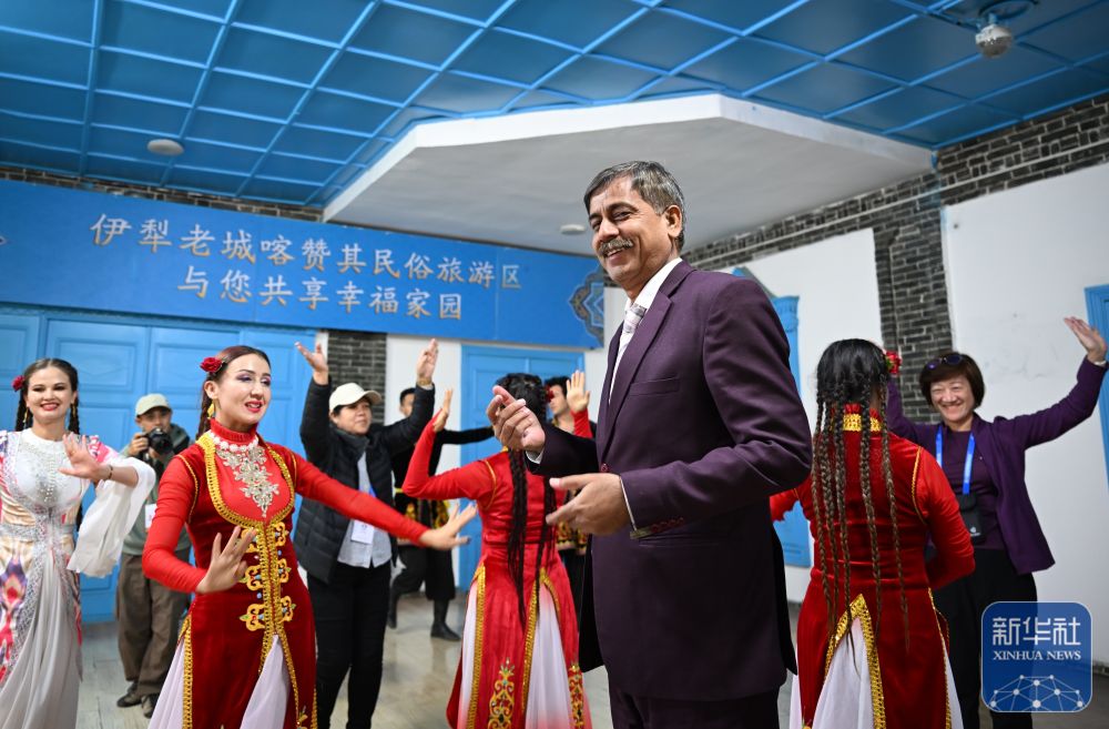 10月15日,與會嘉賓在伊寧市喀贊其民俗旅游區(qū)參訪。 新華社記者 劉續(xù) 攝