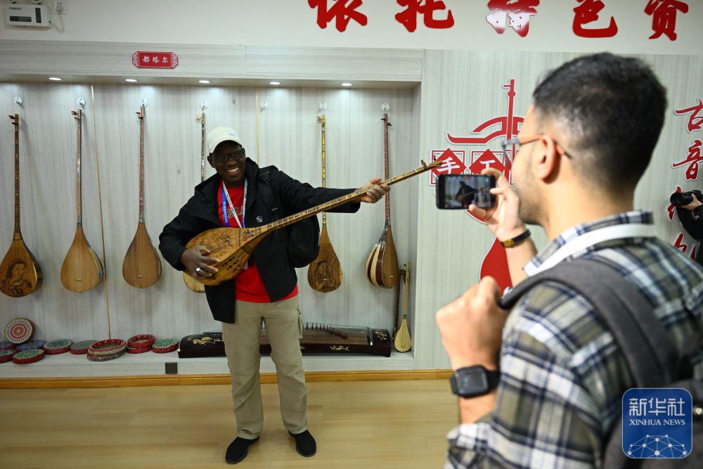10月15日,與會嘉賓在阿克蘇地區(qū)新和縣加依村加依手工樂器產業(yè)園體驗傳統(tǒng)樂器。 新華社記者 劉夢琪 攝