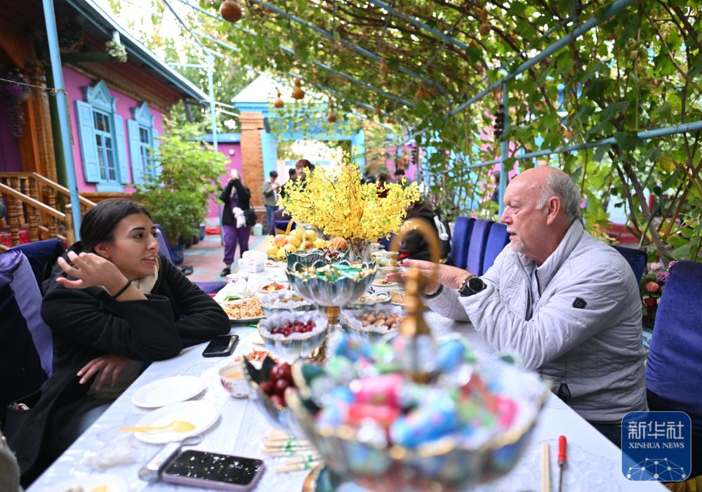 10月15日,與會嘉賓在伊寧市喀贊其民俗旅游區(qū)與表演者互動。 新華社記者 牟宇 攝