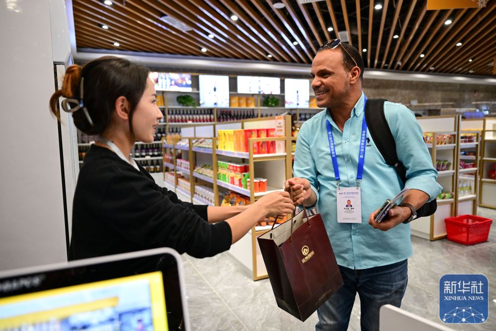 10月15日,與會嘉賓在新疆喀什跨境電商進出口商品展示交易中心購買紀念品。 新華社記者 丁磊 攝