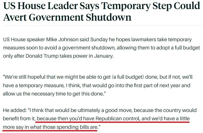 根據(jù)約翰遜的想法,國會應通過一個“能生效至明年上半年”的短期撥款法案,以確保特朗普明年1月就任總統(tǒng)后,共和黨人能有充足的時間來按照自己的政策意愿通過完整的年度預算案。