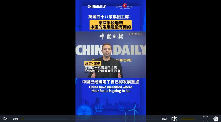 12月5日,由中國(guó)日?qǐng)?bào)社主辦、對(duì)外經(jīng)濟(jì)貿(mào)易大學(xué)協(xié)辦的“新時(shí)代大講堂”活動(dòng)在北京舉行。英國(guó)四十八家集團(tuán)主席、倫敦出口公司CEO杰克·佩里在視頻演講中提到“對(duì)中國(guó)發(fā)展采取遏制手段是沒有用的”,他說“中國(guó)的各種活動(dòng)和博覽會(huì)邀請(qǐng)了所有人,沒有誰會(huì)被中國(guó)拒之門外”。