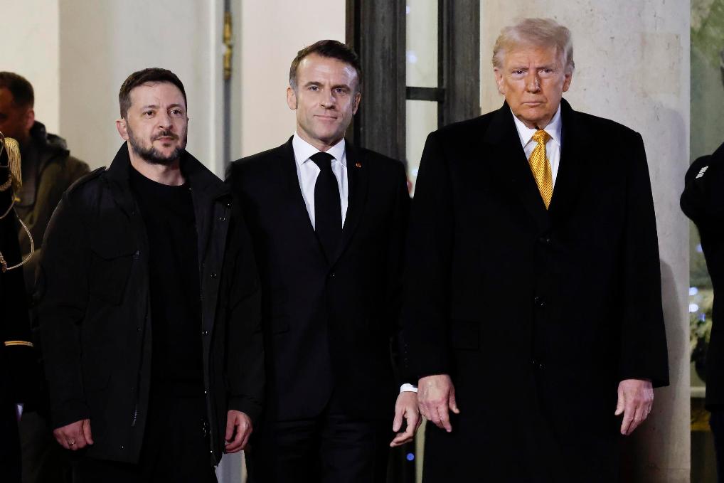 12月7日,法國總統(tǒng)馬克龍(中)與美國當選總統(tǒng)特朗普(右)和烏克蘭總統(tǒng)澤連斯基會晤后走出愛麗舍宮。新華社發(fā)(亨利·施瓦茨攝)