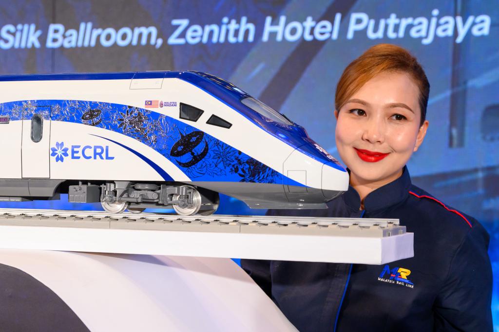 12月18日,在馬來西亞普特拉賈亞,模特與新的動車組模型合影。新華社發(fā)(張紋綜攝)