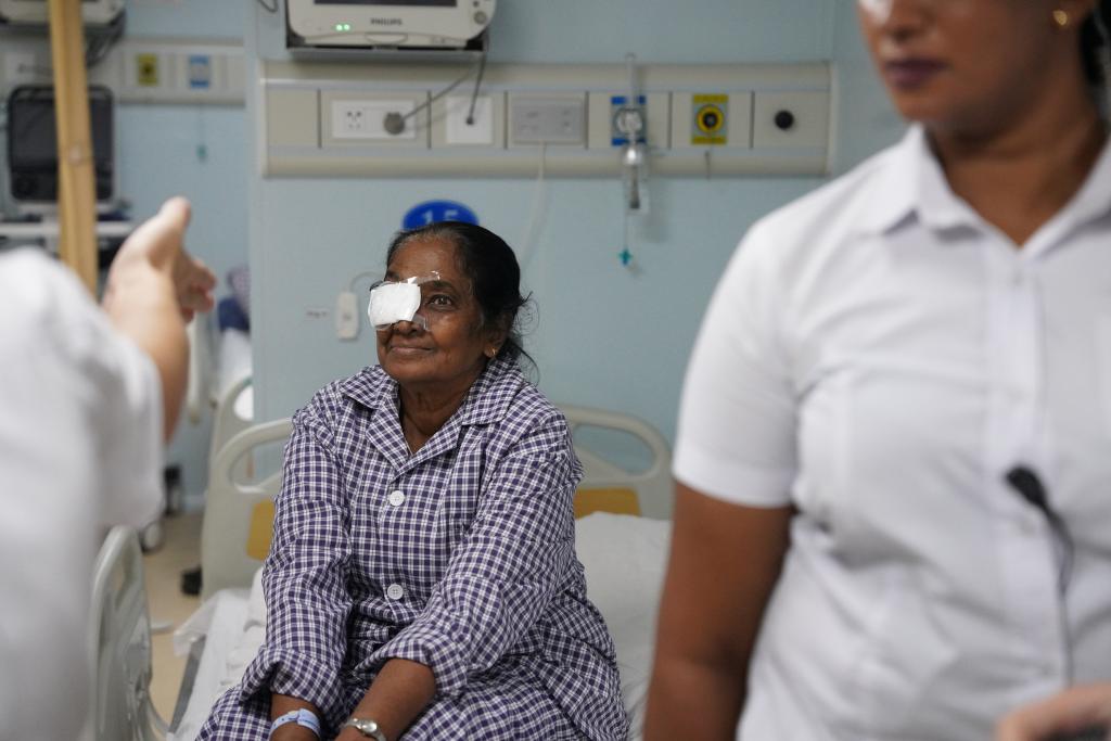 這是2024年12月24日在斯里蘭卡科倫坡港??康闹袊?guó)海軍“和平方舟”號(hào)醫(yī)院船上拍攝的剛進(jìn)行完白內(nèi)障手術(shù)的本地患者。(新華社記者伍岳攝)