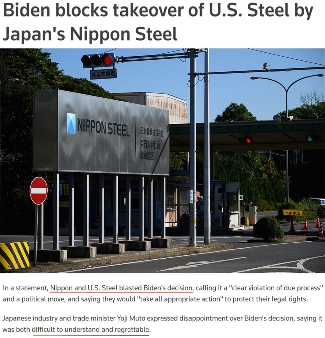 雖然日鐵多次讓步,但美國總統(tǒng)拜登當(dāng)?shù)貢r間3日發(fā)表聲明,正式阻止了這筆價值2萬億日元(按目前匯率約合127億美元)的交易。