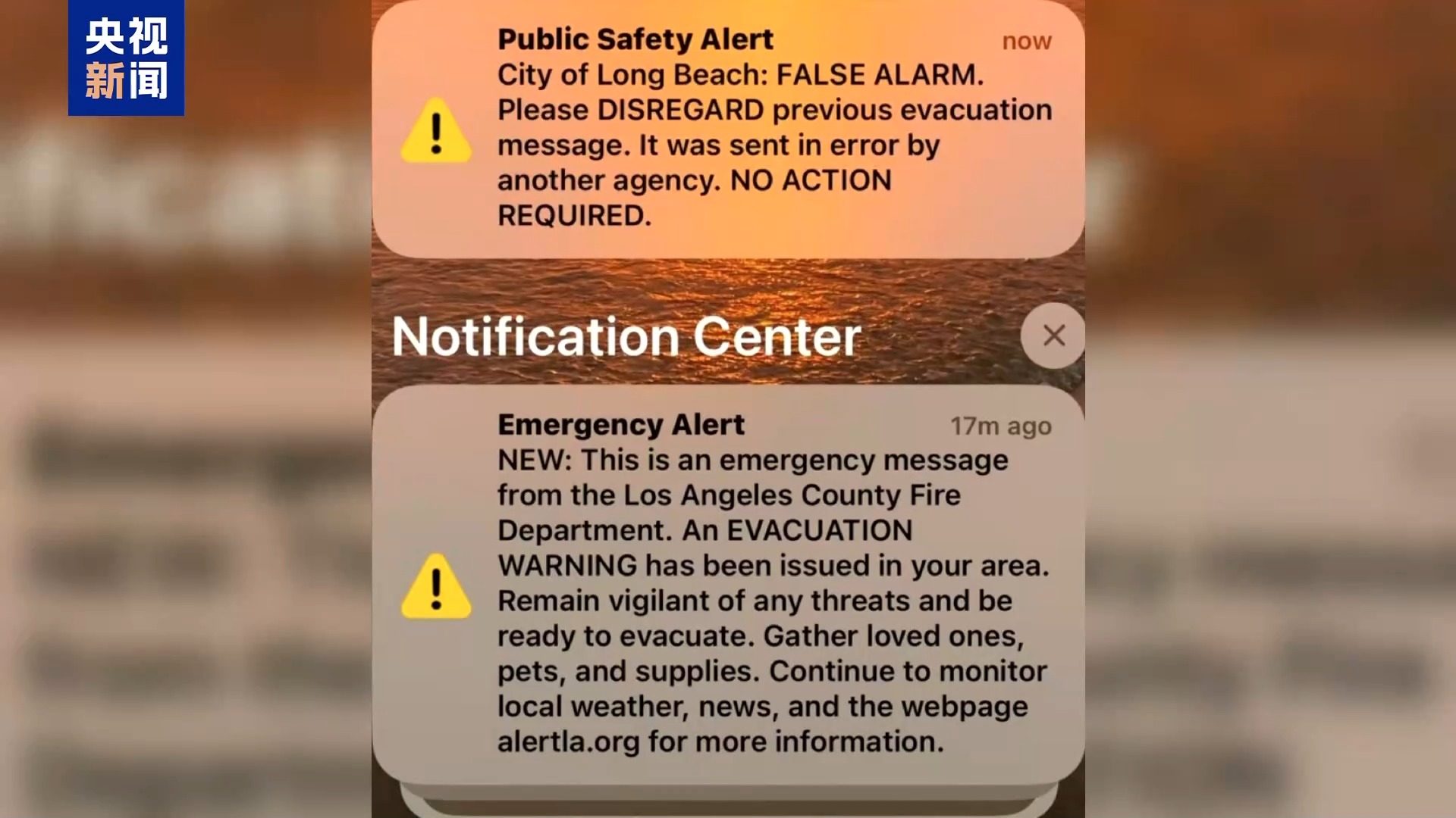 央視記者 劉驍騫:與此同時(shí),根據(jù)我在一線的觀察,人為造成的災(zāi)害正在出現(xiàn)。首先,洛杉磯縣的警報(bào)發(fā)布系統(tǒng)嚴(yán)重失靈,造成撤離信息的混亂。一般情況下,如果你所在的區(qū)域處于撤離預(yù)警或者需要立刻撤離的范圍內(nèi),手機(jī)就會(huì)收到由洛杉磯縣發(fā)布的政府警報(bào)。第一次發(fā)生警報(bào)失靈的情況是10日3時(shí)左右,我的手機(jī)發(fā)出巨大的警報(bào)聲,短信內(nèi)容顯示“我居住的區(qū)域需要立刻撤離”,但是我打開窗,發(fā)現(xiàn)室外并沒有煙味,我立刻登錄了另外幾個(gè)災(zāi)難預(yù)警app,也沒有發(fā)現(xiàn)周遭有新的山火出現(xiàn)。幾乎在同一時(shí)間,很多生活在洛杉磯不同區(qū)域的網(wǎng)友都表示收到了這條警報(bào)。在10日的白天,類似的錯(cuò)誤警報(bào)幾乎每隔幾小時(shí)就出現(xiàn)一次,普通居民也從一開始收到警報(bào)時(shí)的緊張,變成麻木,有的人為了避免過于焦慮,甚至在手機(jī)設(shè)置中關(guān)掉了政府警報(bào)通知。
