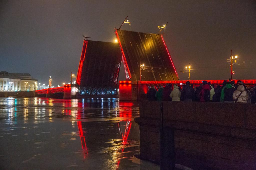 1月29日凌晨,在俄羅斯圣彼得堡,人們在涅瓦河畔觀看亮起“中國紅”的冬宮橋開橋。新華社發(fā)(莫京娜攝)