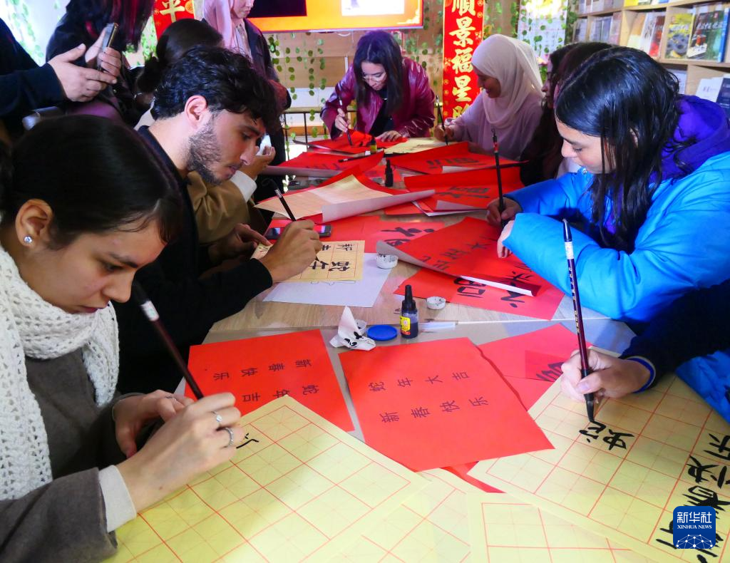 2月1日,在突尼斯首都突尼斯市東方知識書店,中文學(xué)習(xí)者在春節(jié)相關(guān)文化活動中學(xué)寫祝福語。新華社發(fā)(黃靈攝)