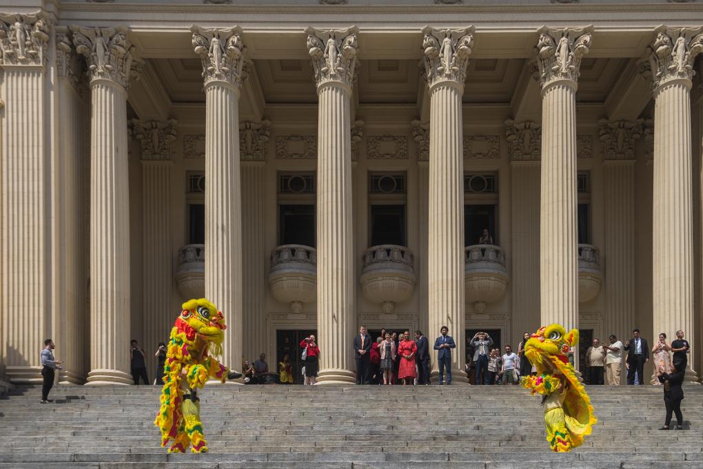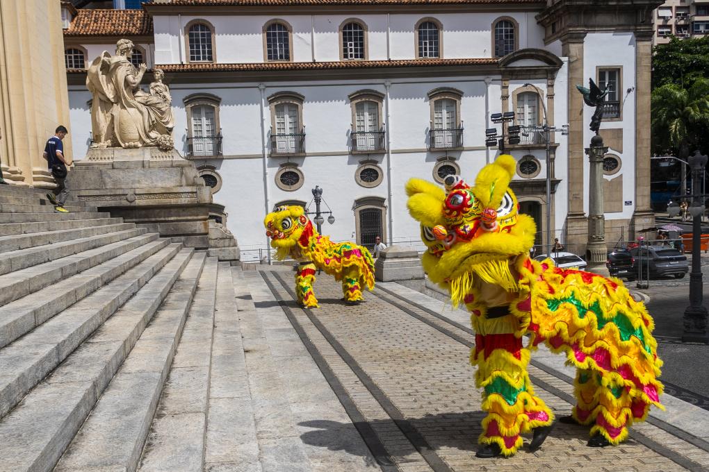 2月6日,中國(guó)農(nóng)歷正月初九,巴西里約熱內(nèi)盧州蒂拉登特斯宮(州議會(huì))大門(mén)外,里約州議會(huì)副議長(zhǎng)蒂婭·茹和中國(guó)駐里約熱內(nèi)盧總領(lǐng)事田敏用手中的毛筆共同為兩只舞獅點(diǎn)睛。瞬間,“獅子”舞動(dòng)起來(lái),里約州議會(huì)中國(guó)農(nóng)歷新年慶典拉開(kāi)帷幕。