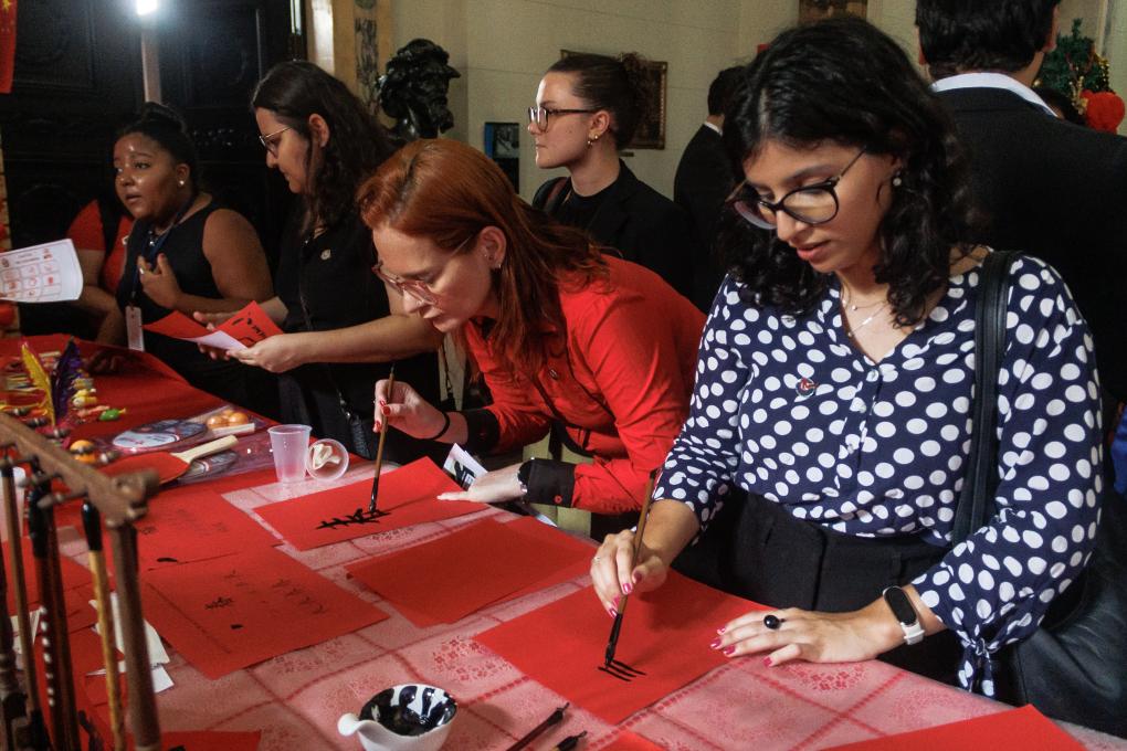 2月6日,在巴西里約熱內(nèi)盧州蒂拉登特斯宮(州議會(huì)),人們?cè)隗w驗(yàn)書(shū)法。新華社發(fā)(克勞迪婭·馬爾提尼 攝)