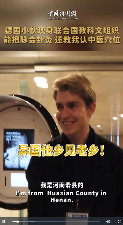 由中國(guó)常駐聯(lián)合國(guó)教科文組織代表團(tuán)與河南衛(wèi)視共同舉辦的“我們的春節(jié)”慶?;顒?dòng)當(dāng)?shù)貢r(shí)間6日晚在位于法國(guó)巴黎的聯(lián)合國(guó)教科文組織總部華美亮相。活動(dòng)現(xiàn)場(chǎng),記者遇到德國(guó)小伙推介中醫(yī)文化。這位名叫“無(wú)名”的德國(guó)小伙,早已憑借地道的河南話和對(duì)中醫(yī)的熱愛(ài)多次爆火出圈。在法國(guó)巴黎聯(lián)合國(guó)教科文組織總部,參與“我們的春節(jié)”活動(dòng)之余,無(wú)名還開(kāi)啟了中醫(yī)小課堂。(王高飛)