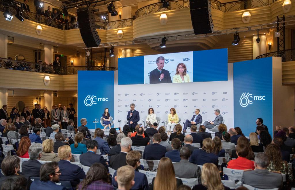 2024年2月18日,慕安會(huì)主席克里斯托夫·霍伊斯根(中左二)在德國慕尼黑舉行的第60屆慕尼黑安全會(huì)議上發(fā)表閉幕致辭。新華社記者 張帆 攝
