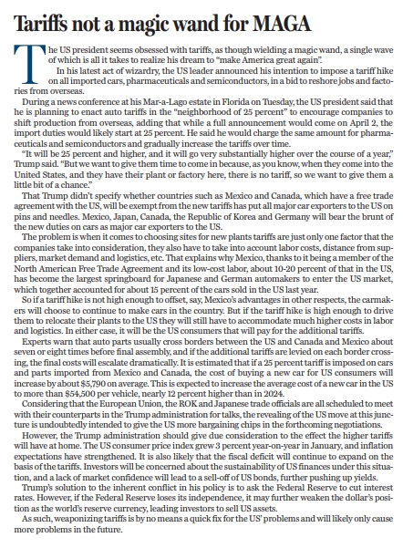 但是,特朗普政府也應該充分考慮高額關稅將給其國內帶來的影響。美國1月CPI同比增速升至3%,通脹預期不斷加強。在加征關稅的基礎上,美國的財政赤字很可能將持續(xù)擴大。在這種情況下,投資者將對美國財政的可持續(xù)性產生擔憂,而市場信心缺失會導致美債被拋售,從而進一步推高收益率。