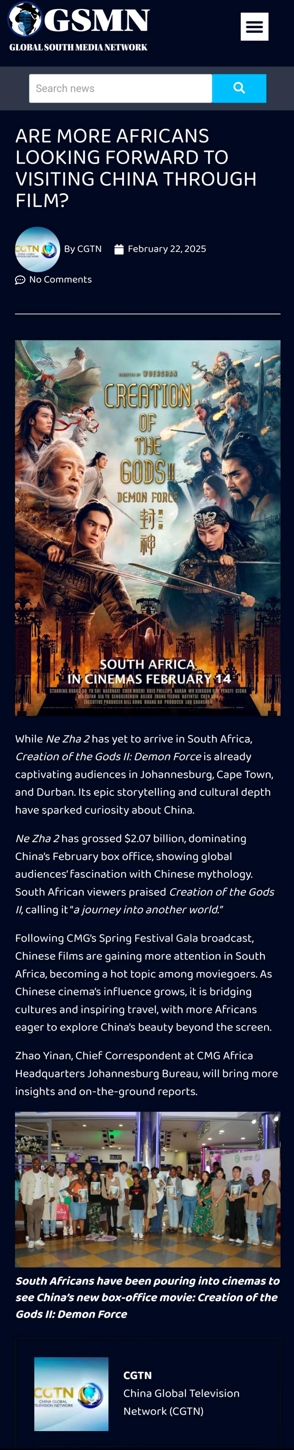此外,中國春節(jié)檔電影登陸非洲并引發(fā)廣泛影響的相關(guān)報(bào)道被肯尼亞廣播公司、南非獨(dú)立傳媒、南非《外交圈報(bào)》、全球南方新聞網(wǎng)、贊比亞5fm電臺、津巴布韋廣播公司、岡比亞之聲、剛果新聞網(wǎng)等多家媒體轉(zhuǎn)引轉(zhuǎn)載,觸達(dá)超1億受眾。