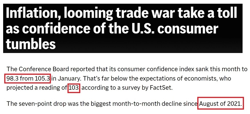 各家媒體紛紛用“暴跌”“直線下降”“急劇惡化”等詞匯來形容美國消費者信心的顯著下滑。