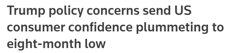 報道稱,特朗普是因為向美國人承諾會降低通脹和物價才當(dāng)選總統(tǒng)的。在他獲勝后,美國企業(yè)和消費者信心曾一度飆升。但他在上任后的僅僅一個月內(nèi)就宣布了連串加征關(guān)稅計劃,從而“導(dǎo)致美國消費者信心暴跌至八個月以來的最低點”。