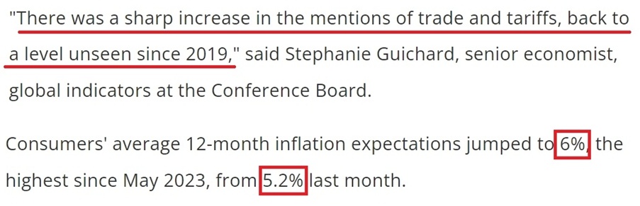 在美國CCI以三年半以來的最大速度惡化的同時,美國消費者對未來一年的通脹預(yù)期也從5.2%大幅升高至6%,達到2023年5月以來的最高水平。這進一步顯示,美國人對特朗普政府政策可能對經(jīng)濟造成的負面影響越來越擔(dān)憂。