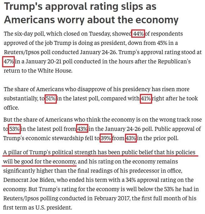 路透社在報道中指出,特朗普政治實力的一個支柱就是不少人相信他的政策對經(jīng)濟有利,而最新民調(diào)結(jié)果顯示,越來越多的美國人因為這位新總統(tǒng)威脅要對外加征關(guān)稅而對美國的經(jīng)濟發(fā)展方向感到擔(dān)憂。