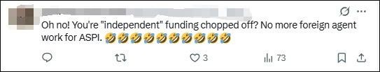 “哦豁!‘獨立智庫’的資金被切斷啦?ASPI這下做不成外國代理人的勾當(dāng)咯?!?/p>