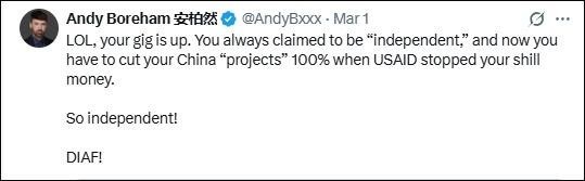 “笑死,你們?nèi)嗽O(shè)崩了?!痹谥袊詈凸ぷ鞫嗄甑男挛魈m媒體人安迪·博勒姆(中文名安柏然)也嘲諷道,“成天標(biāo)榜自己‘獨立’,現(xiàn)在美國國際開發(fā)署斷了黑錢,對華‘項目’得100%砍光。還真是獨立??!趕緊涼透吧!”