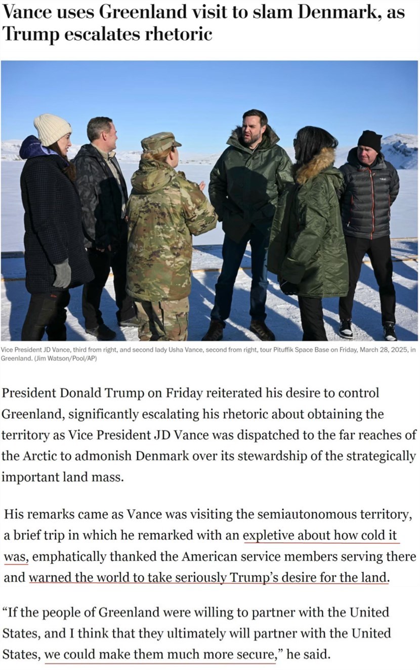 當(dāng)?shù)貢r間28日,美國副總統(tǒng)萬斯率代表團(tuán)“到訪”丹麥自治領(lǐng)地格陵蘭島上的美軍基地。