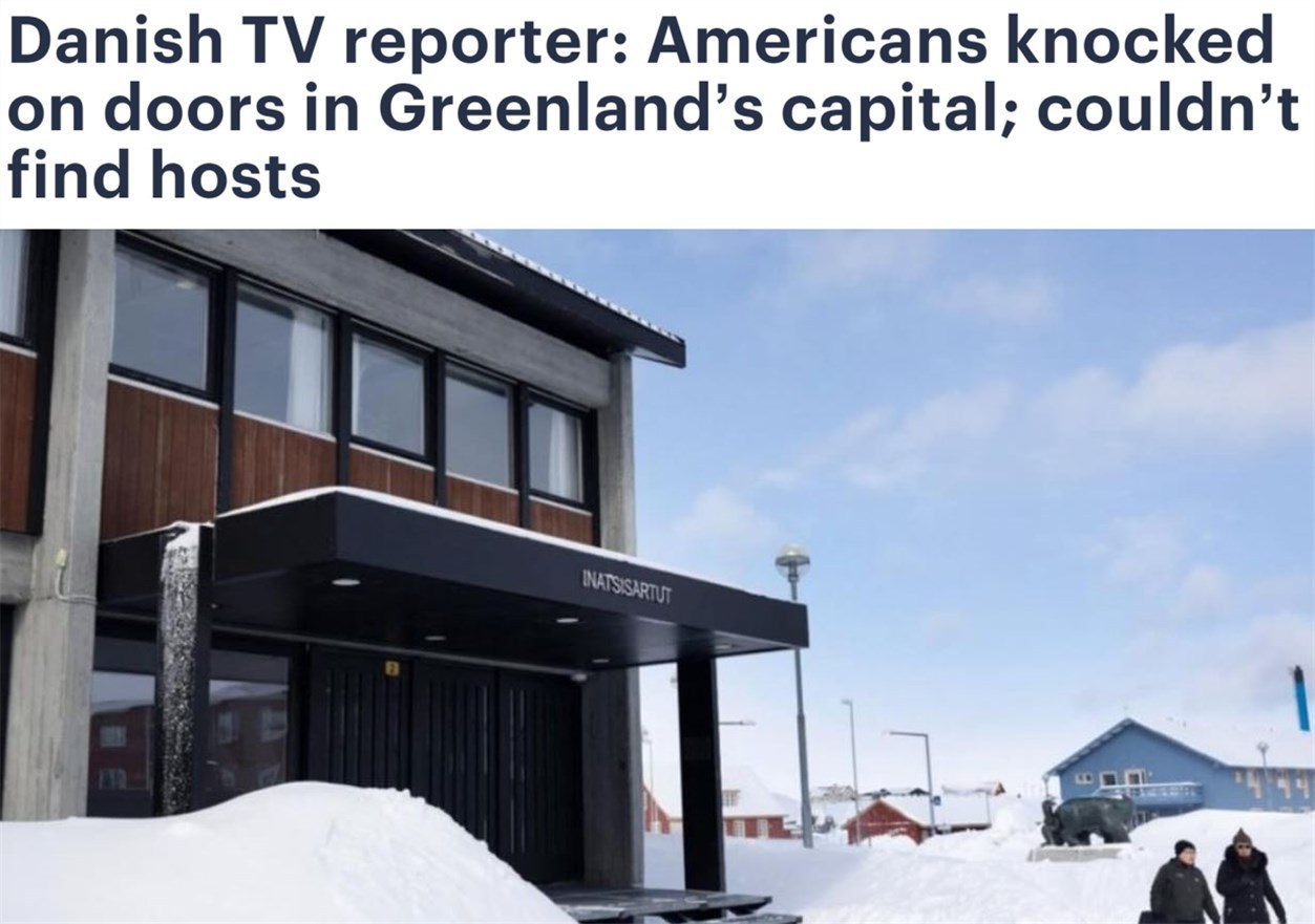 據(jù)丹麥電視二臺記者賈斯珀·斯坦梅茨在節(jié)目中披露,萬斯率領(lǐng)的代表團(tuán)出發(fā)之前,美國政府已秘密派人到格陵蘭島相關(guān)地區(qū)“做工作”,希望當(dāng)?shù)孛癖姎g迎萬斯一行,但卻碰了一鼻子灰。