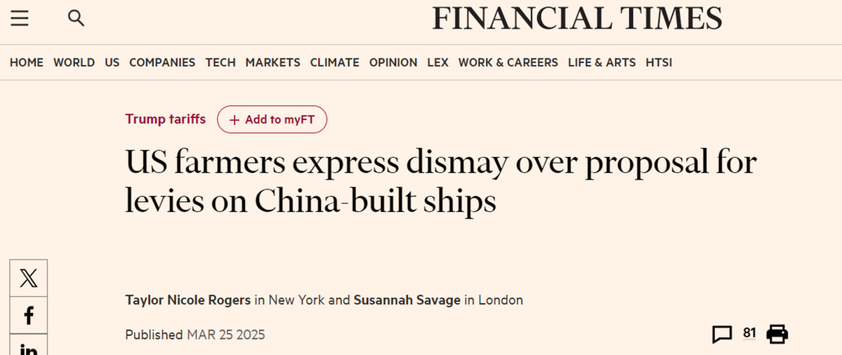 另據(jù)英國《金融時報》報道,美國中西部農(nóng)民非常擔憂,加征“港口費”必將進一步削弱農(nóng)產(chǎn)品出口競爭力。美國大豆出口委員會首席執(zhí)行官吉姆·薩特表示,整個行業(yè)對提案“措手不及”。