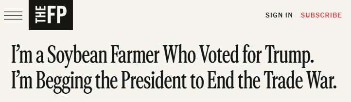 近日,拉格蘭德在The Free Press刊文表示,這場不斷升級的貿易戰(zhàn)對美國豆農來說是個沉重打擊,因為中國是其最大的海外市場。對于許多美國大豆種植戶來說,這仿佛是2018年噩夢般場景的重現(xiàn)。那是特朗普總統(tǒng)的第一個任期,其采取的關稅措施使美國農業(yè)損失了260億美元,僅大豆產業(yè)就損失了近200億美元。