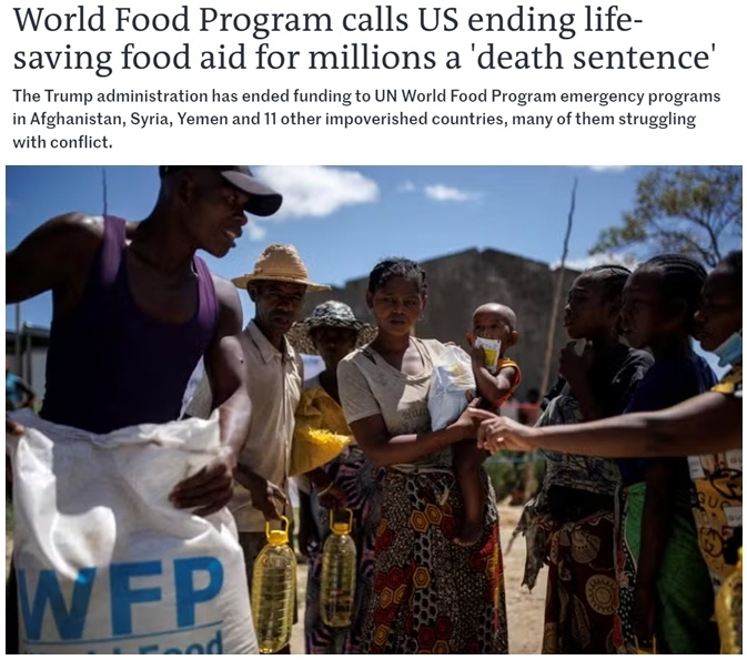 世界糧食計(jì)劃署警告說(shuō),美國(guó)中斷緊急糧食援助相當(dāng)于是對(duì)千百萬(wàn)面臨極端饑餓的民眾“判處死刑”。