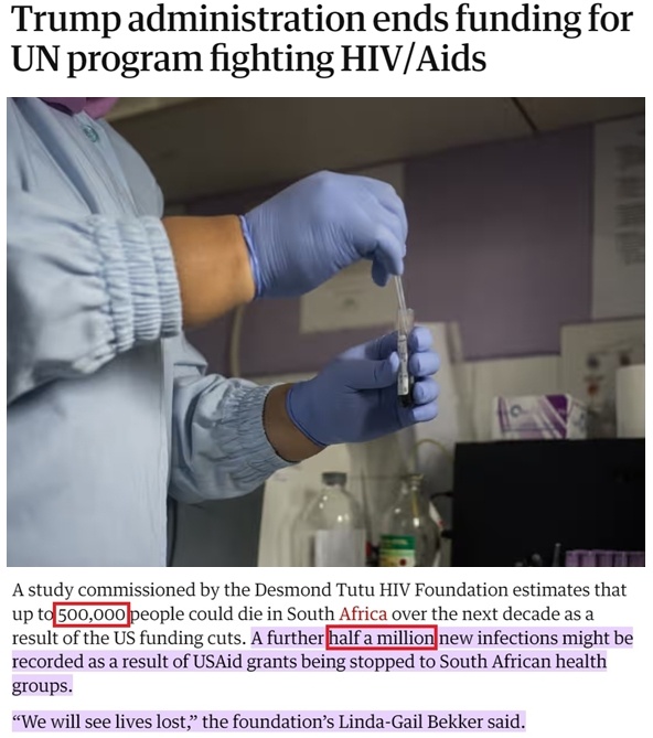 南非德斯蒙德·圖圖艾滋病中心主任琳達(dá)-蓋爾·貝克爾告訴記者,美國(guó)取消對(duì)當(dāng)?shù)乜拱M織的資助將導(dǎo)致“超過(guò)50萬(wàn)不必要的死亡以及多達(dá)50萬(wàn)新增感染病例”,使有關(guān)方面“過(guò)去25年的所有努力付諸東流”。