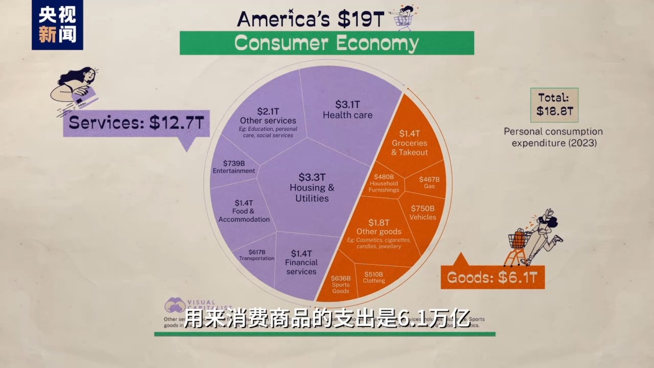 按美國勞動局數(shù)據(jù),美國人2023年消費支出18.8萬億美元,其中12.7萬億花在了看病、租房、交學(xué)費、打官司等服務(wù)上,用來消費商品的支出是6.1萬億,不到總消費的三分之一。所以吹噓美國消費能力強屬實是個“地獄笑話”,看病花錢多有什么可驕傲的?