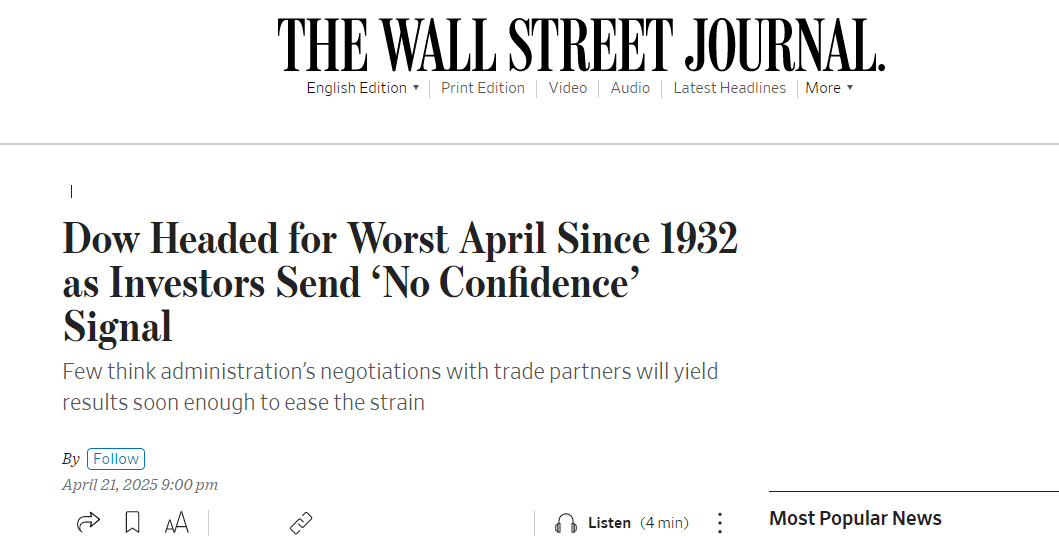 另?yè)?jù)《華爾街日?qǐng)?bào)》4月21日?qǐng)?bào)道,道指或?qū)?chuàng)下近百年來(lái)最差4月表現(xiàn),投資者發(fā)出“不信任”信號(hào)。