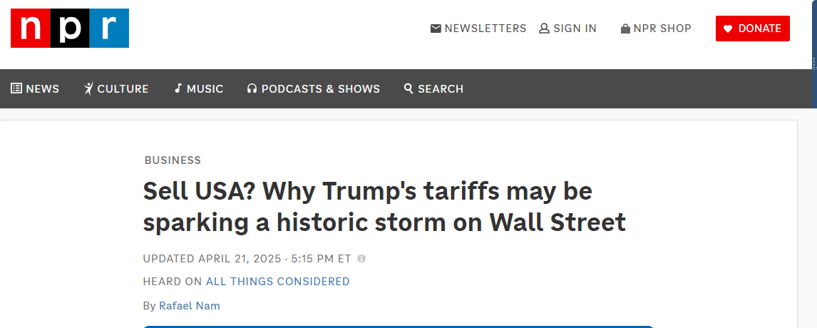 據(jù)美國(guó)國(guó)家公共廣播電臺(tái)(NPR)網(wǎng)站4月21日?qǐng)?bào)道,美國(guó)金融體系過(guò)去被視為全球最穩(wěn)定和強(qiáng)大的體系之一。然而,由于美國(guó)現(xiàn)任政府4月2日推出的所謂全球“對(duì)等關(guān)稅”政策,美國(guó)金融市場(chǎng)出現(xiàn)了前所未有的危機(jī):全球投資者可能因美國(guó)政策的不確定性而對(duì)美國(guó)失去信心。