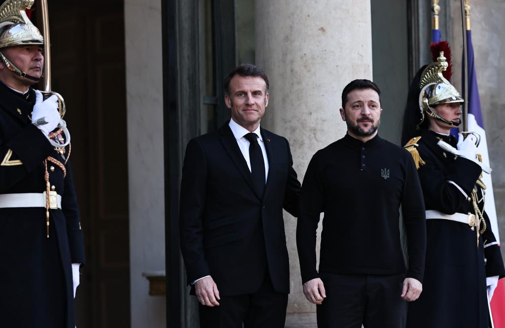 3月26日,法國(guó)總統(tǒng)馬克龍(中左)在巴黎總統(tǒng)府愛(ài)麗舍宮迎接到訪的烏克蘭總統(tǒng)澤連斯基。新華社記者高靜攝