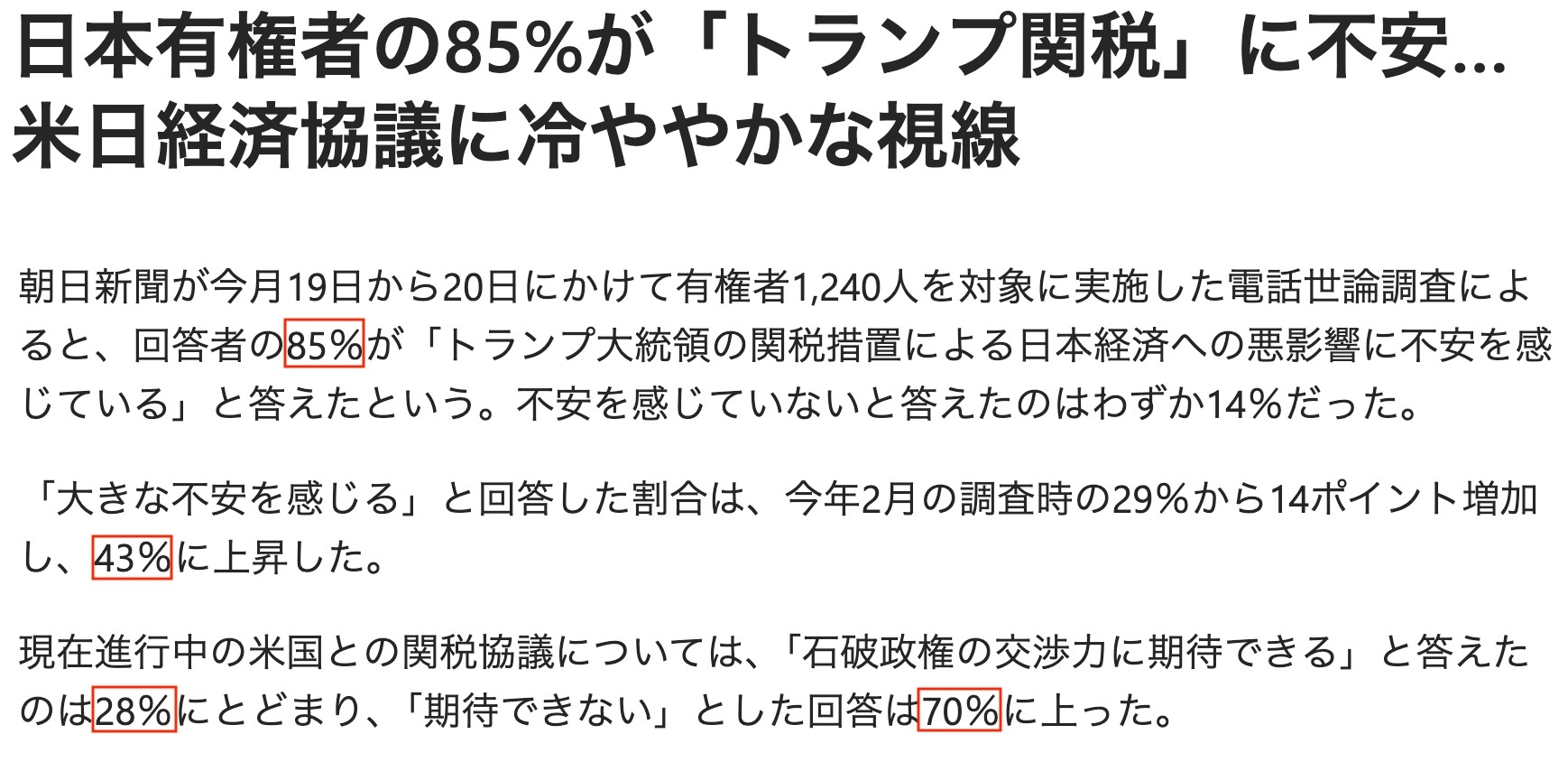 此外,多達(dá)70%的受訪者對(duì)日本政府與美國政府就關(guān)稅問題進(jìn)行的交涉不抱期待。