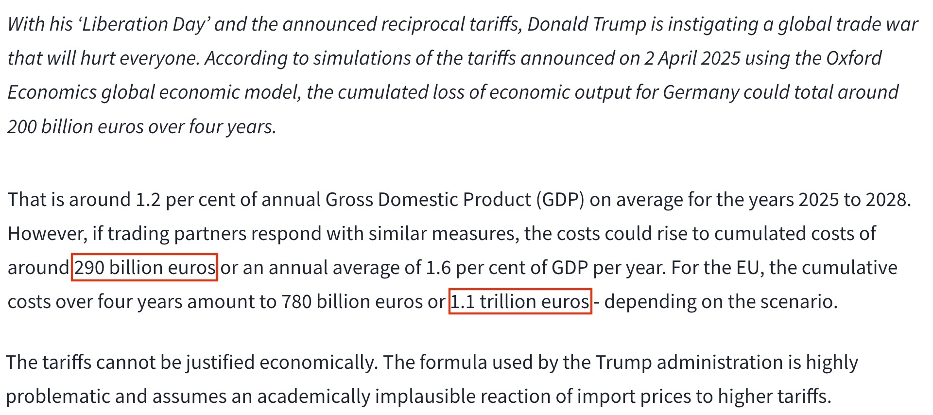 德國經(jīng)濟(jì)研究所日前發(fā)布的研究報(bào)告顯示,未來四年內(nèi),美國“對(duì)等關(guān)稅”措施可能令歐盟損失1.1萬億歐元,僅德國就將損失2900億歐元。
