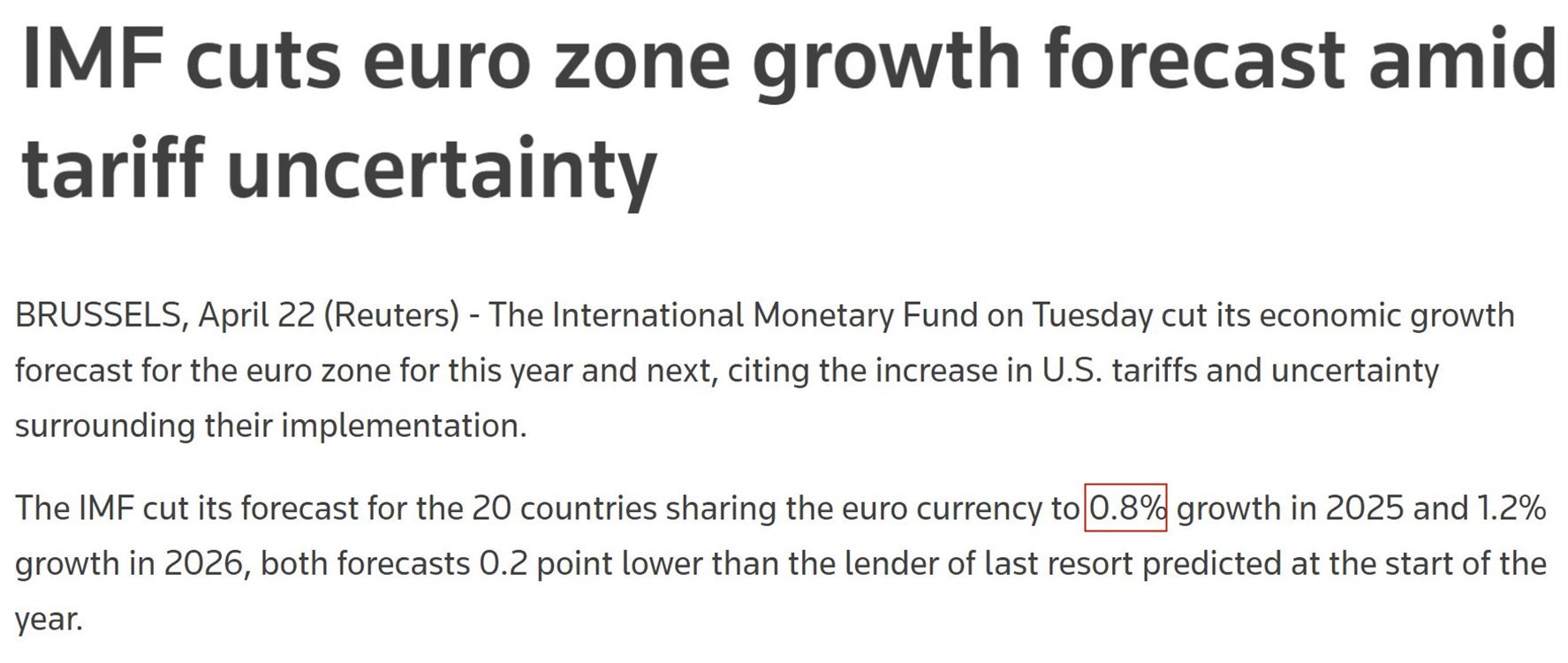 根據(jù)國際貨幣基金組織22日發(fā)布的最新一期《世界經(jīng)濟(jì)展望報(bào)告》,受美國關(guān)稅措施沖擊和政策不確定性的影響,今年歐元區(qū)經(jīng)濟(jì)增長率預(yù)計(jì)將比之前下調(diào)0.2個(gè)百分點(diǎn)至0.8%。