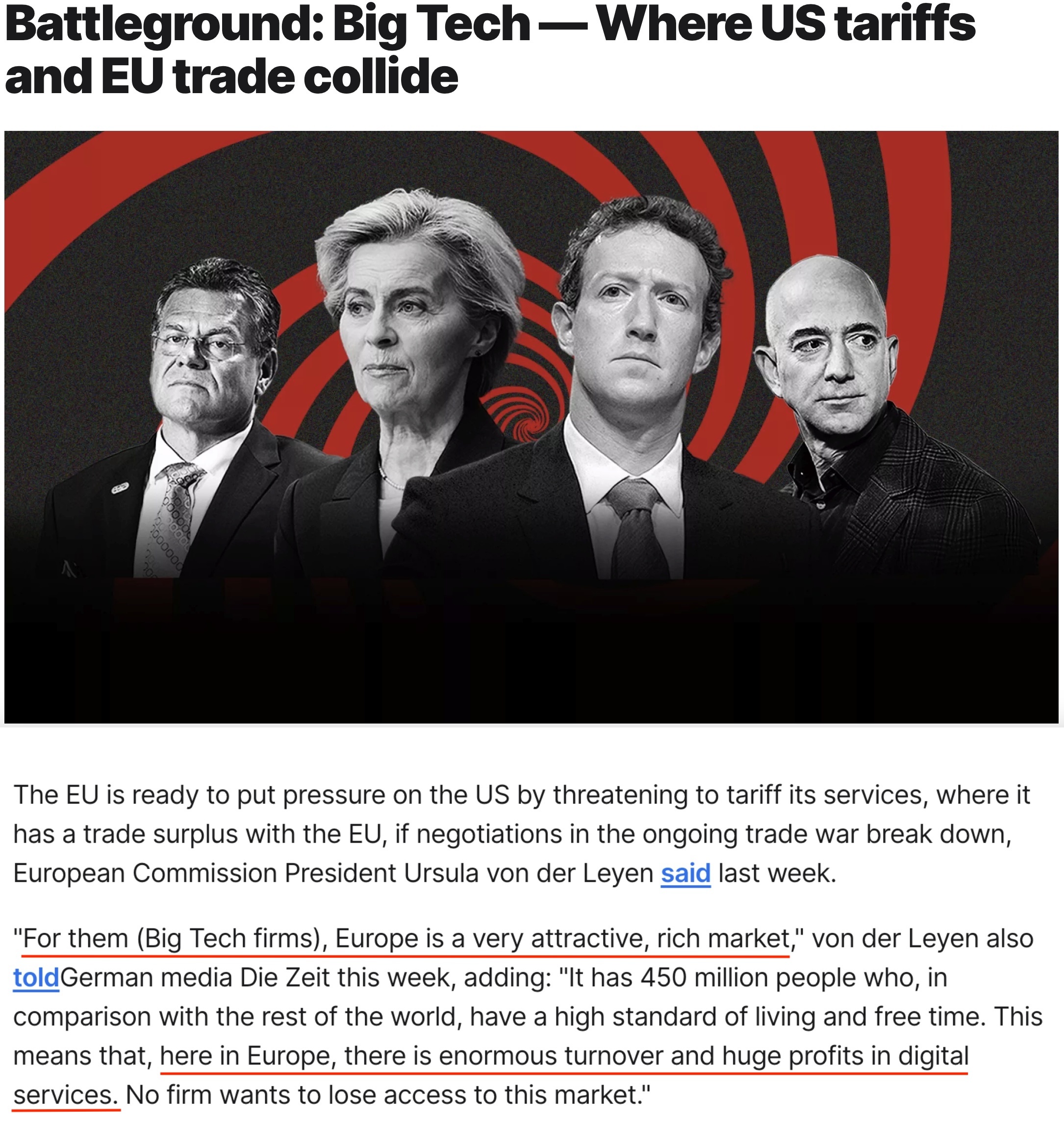 馮德萊恩強(qiáng)調(diào),歐盟有4.5億人口,民眾生活水平高,這意味著在歐盟,數(shù)字服務(wù)有著巨大的營業(yè)額和利潤,沒有誰愿意失去進(jìn)入這個(gè)市場(chǎng)的機(jī)會(huì)。