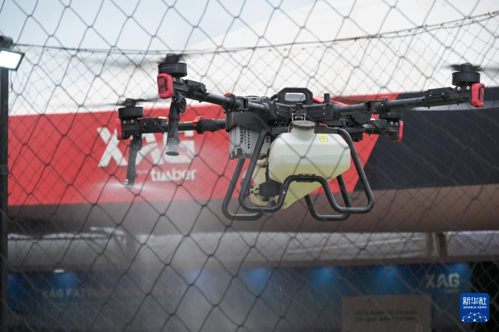 4月29日,在巴西圣保羅州里貝朗普雷圖市舉行的2025年巴西農業(yè)科技展上,一架極飛農業(yè)無人機進行噴灑演示。新華社記者 陳昊佺 攝